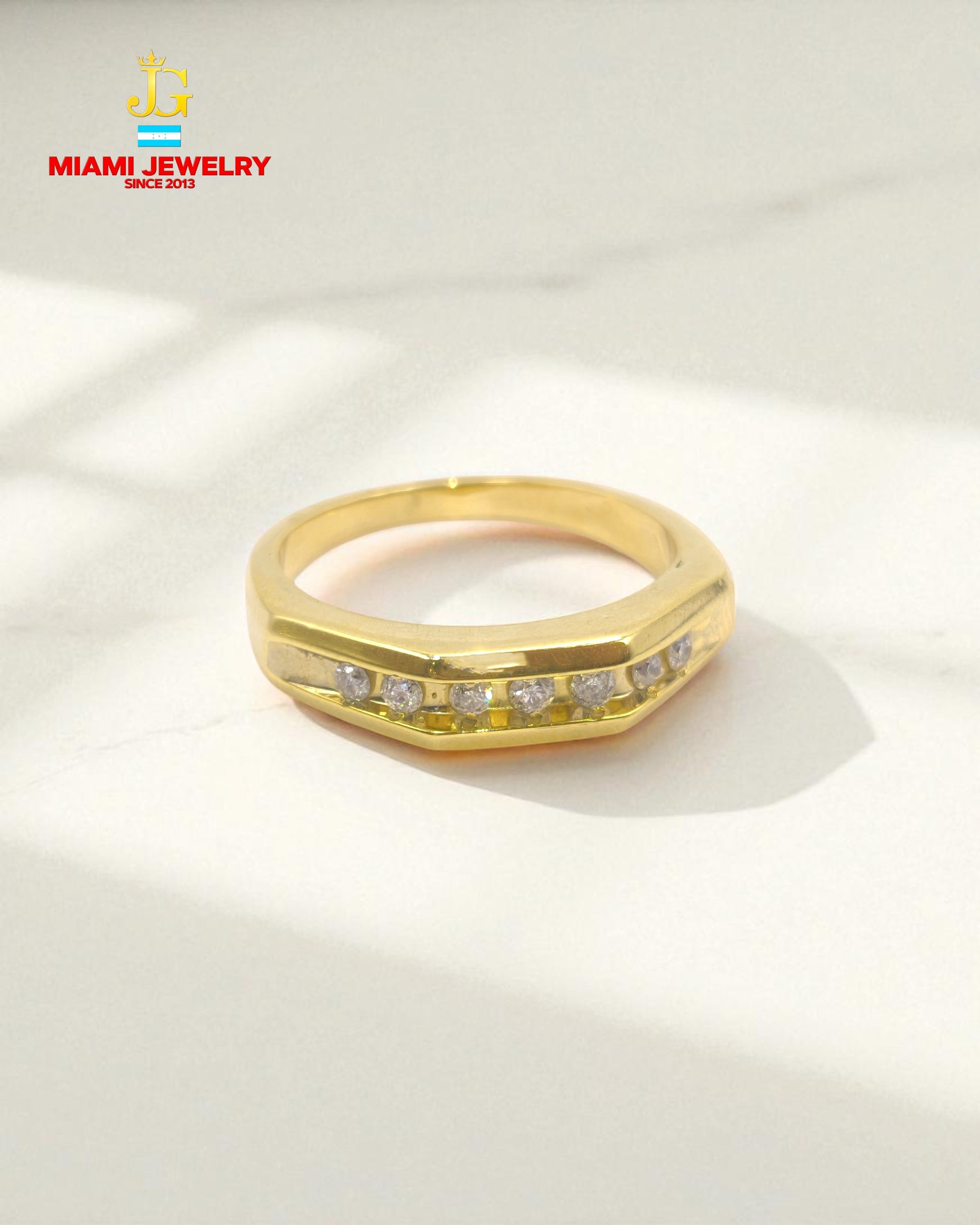 Solid 14k yellow gold wedding ring band with white-zirconia gemstones .